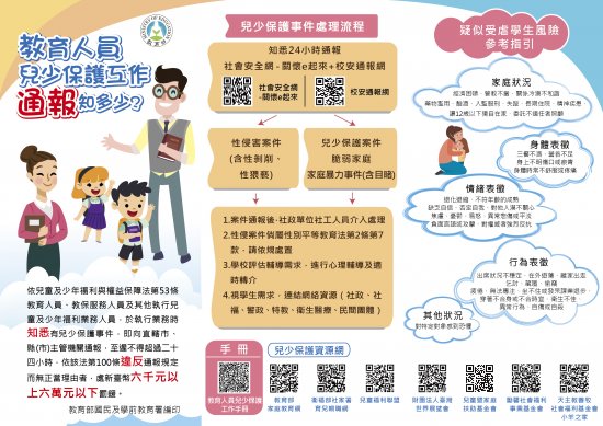一、為落實校園內兒少保護工作,國教署研發製作校園兒少保護宣導單張,以提供校園教育工作者相關資訊,加強對兒童虐待的覺察及處遇能力。