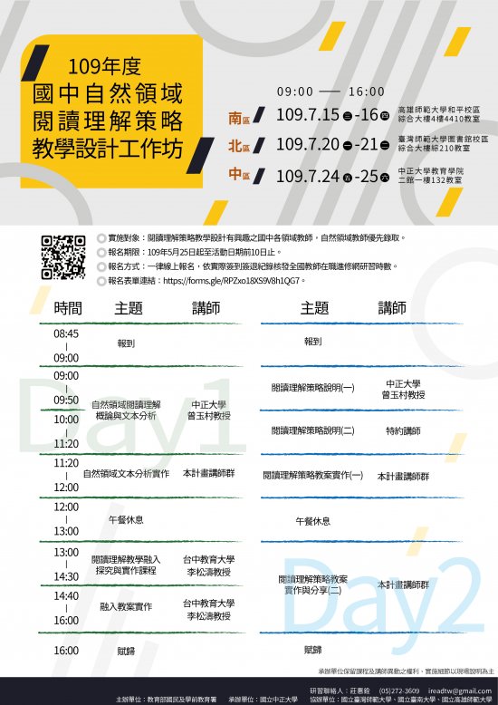 主旨:「108-110年度閱讀師資培育─區域人才培育中心計畫(中區)」。 檢附109年暑期閱讀相關研習資訊表、「109年度國中自然 領域閱讀理解策略教學設計工作坊」修正版宣傳海報、 「109年度課文本位閱讀理解策略教學-進階工作坊(花蓮 場)」宣傳海報、「109年度國中國文科閱讀理解策略教學 工作坊」宣傳海報各1份。