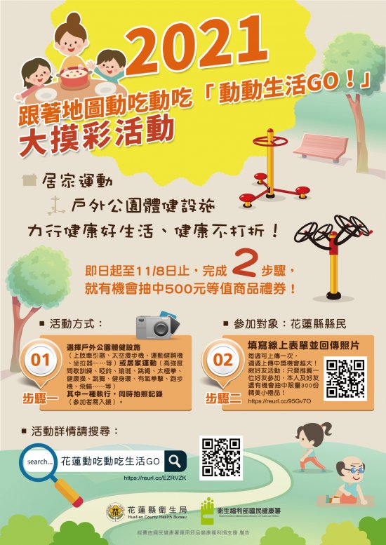花蓮縣衛生局為提升民眾在疫情期間,仍能維持規律運動習慣,特辦理旨揭活動,推廣民眾進行戶外公園體健設施運動及居家運動,鼓勵踴躍參與。