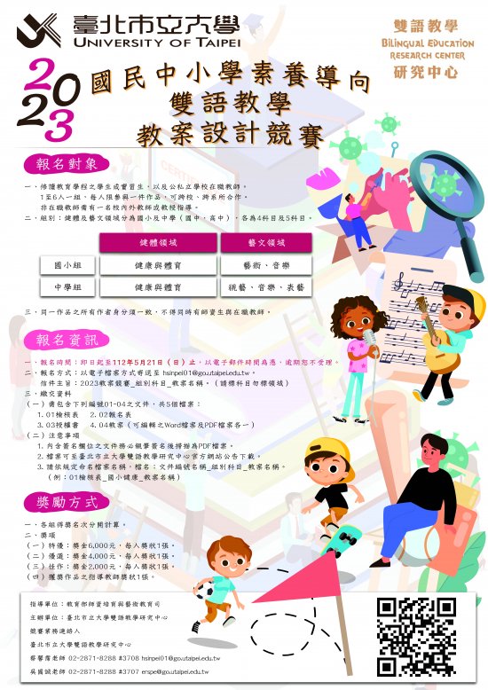 五、 | 競賽連絡人:臺北市立大學雙語教學研究中心 蔡馨霈教師 (02)2871-8288#3708 或 hsinpei01@go.utaipei.edu.tw。 |