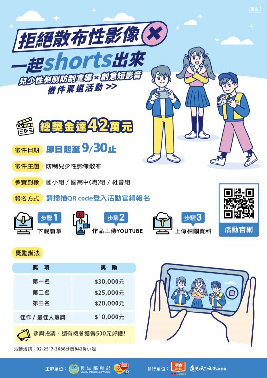 因應數位/網路兒少性剝削案件逐年增加,各界高度關注網路性犯罪議題,且為強化「兒童及少年性剝削防制條例」修法重點「避免成為兒童及少年性剝削共犯、不應把兒童及少年視為性的對象」之防制宣導,延長本活動徵件時間至113年9月30日止,活動計畫、海報詳如附件。